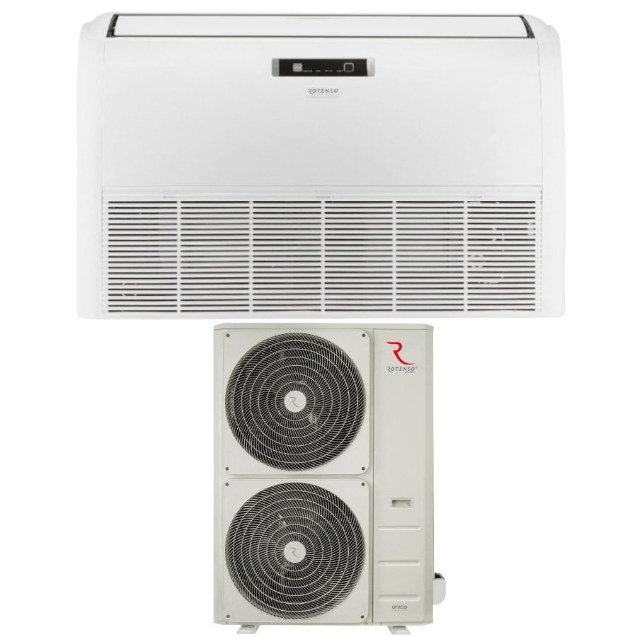 Klimatyzator przypodłogowo-podsufitowy Rotenso® Jato o mocy 15,8 kW to wszechstronne urządzenie, które można zamontować zarówno na ścianie (w pionie), jak i na suficie (w poziomie). Jest to jednostka o niskim poziomie hałasu, oznaczona jako klasa energetyczna chłodzenia A++.